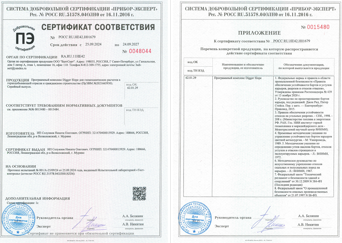 В программе реализовано проведение эмпирического анализа на основе рейтинговых классификаций Qslope, SMR, MRMR, результаты которого позволяют произвести оценку устойчивости откосов на разных масштабных уровнях (уступ, группа уступов), а также оценить предельный устойчивый генеральный угол борта по методикам Фисенко и Хука.